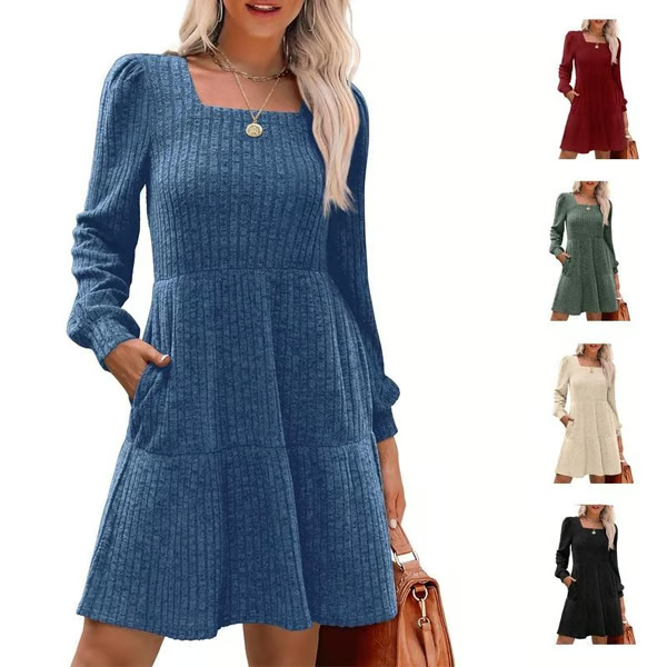 This dress features a stylish knit design with a relaxed, comfortable fit. The square neckline adds dimension and charm to the overall look. Pair it with boots or heels for effortlessly chic sophistication.
